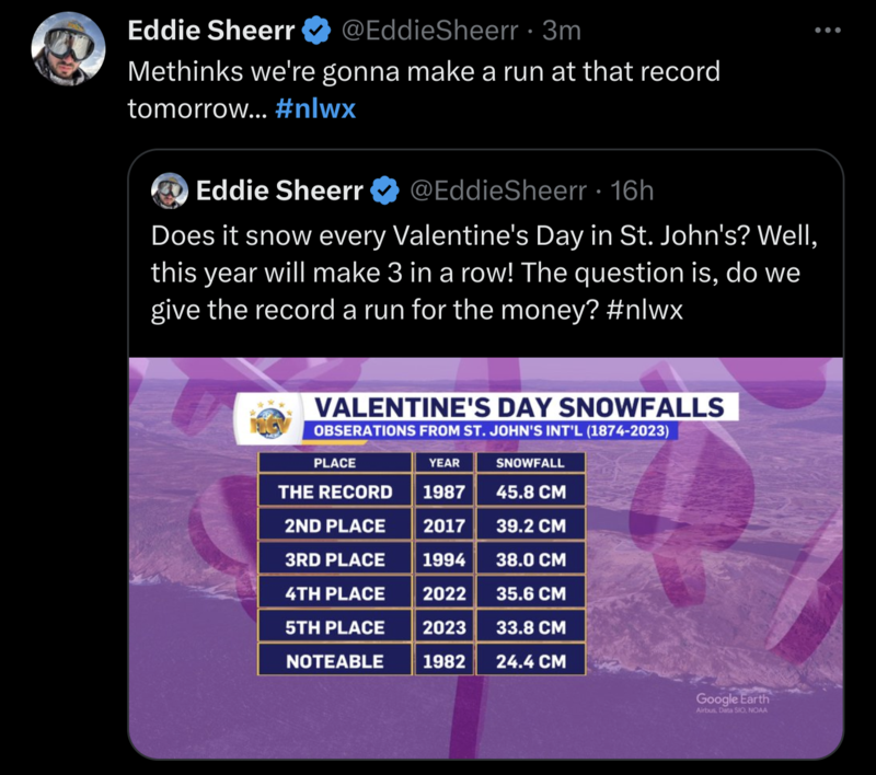 Meanwhile, I think eastern NL will be the ones getting snowmageddon this time... best of luck to them.