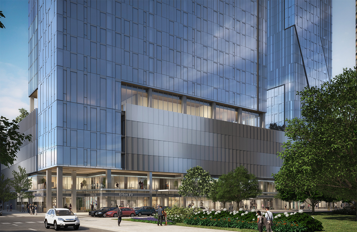 As proposed, the east tower contains approximately 537 apartments, 23,405 square feet of retail space, and 397 parking spaces; the west tower consists of approximately 516 apartments, 6,904 square feet of retail space, and an additional 33 parking spaces within the garage.