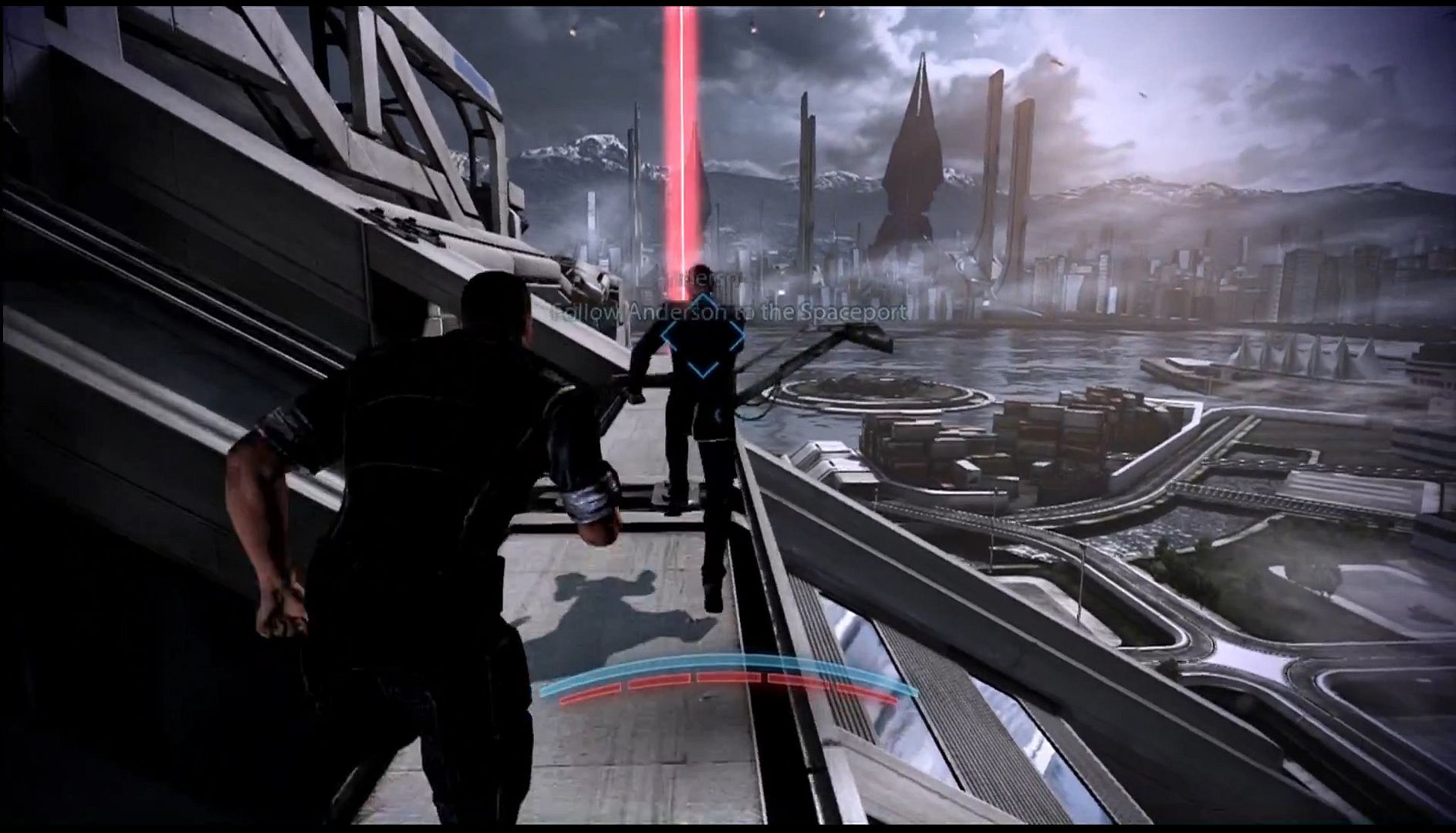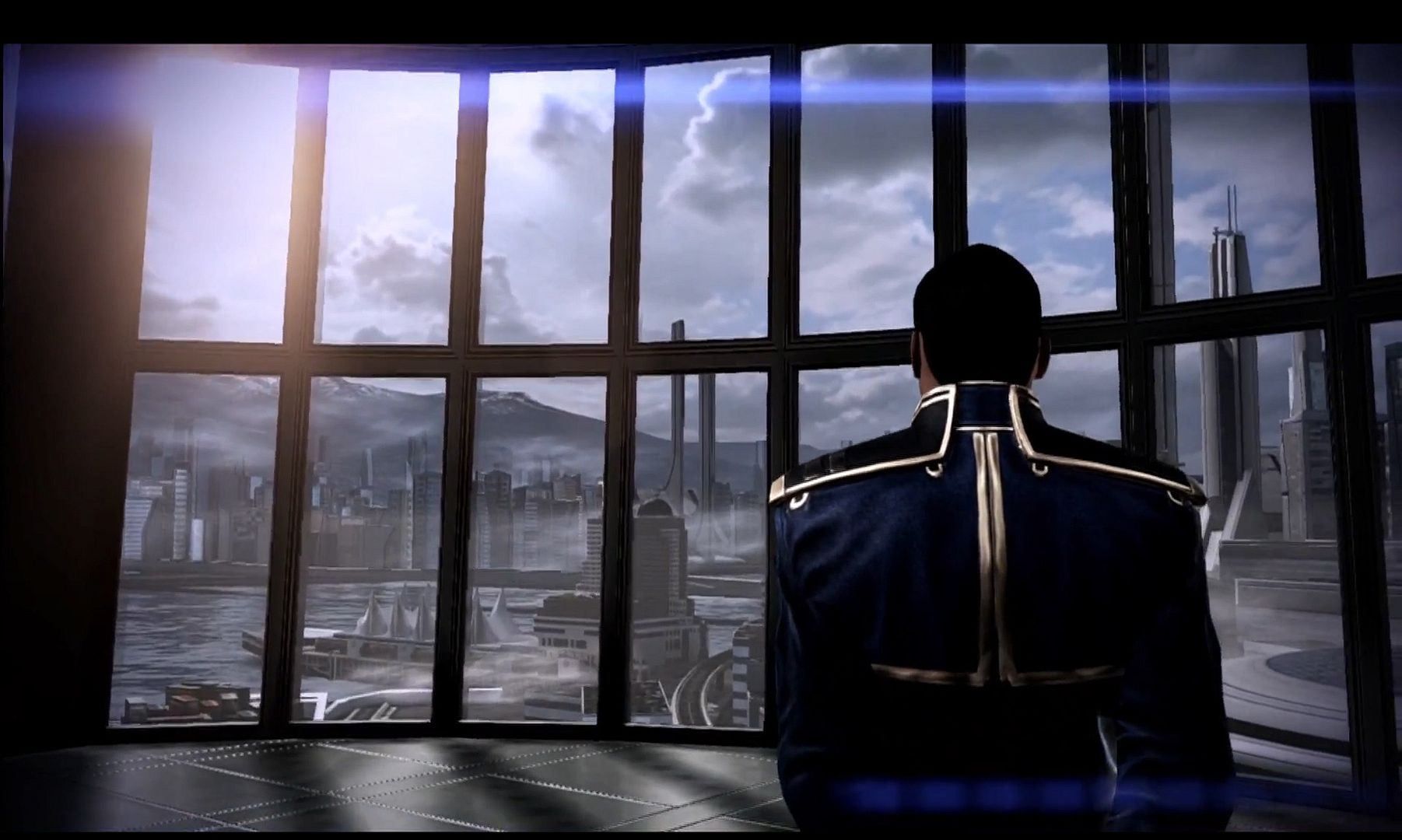 We were informed this scene occurs shortly after Commander Shepherd returns to Earth to face trial for his actions in Mass Effect 3, (implying that Vancouver is a major Alliance city). We’ll obviously know more once the game is released, but it appeared to us as though Vancouver and Seattle have grown into a single city, and Vancouver has spread across the strait from British Columbia to Vancouver island. The Coast Mountain range is visible in the distance, and Vancouver’s distinctive architecture is apparent, if futurified. And it was gorgeous. Which contrasted nicely with the bleak setting of Mass Effect, fully established by the dozens of Reapers descending on the burning city in the final invasion of Earth.