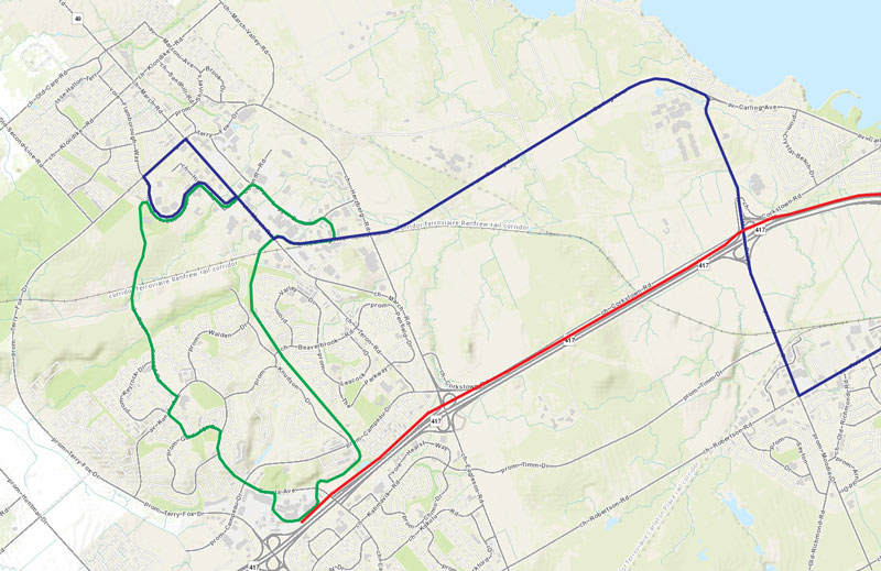 For fun, I have included a path for an autonomous electric vehicle, following the green line. I have put it along the Golf course corridor, since that will be new development, and is fairly central. This would give Kanata North the chance to prove that it is a leaded in small, autonomous transit vehicles. (Because of the potential for snow-covered roads, I would suggest using a buried-wire guidance.)
